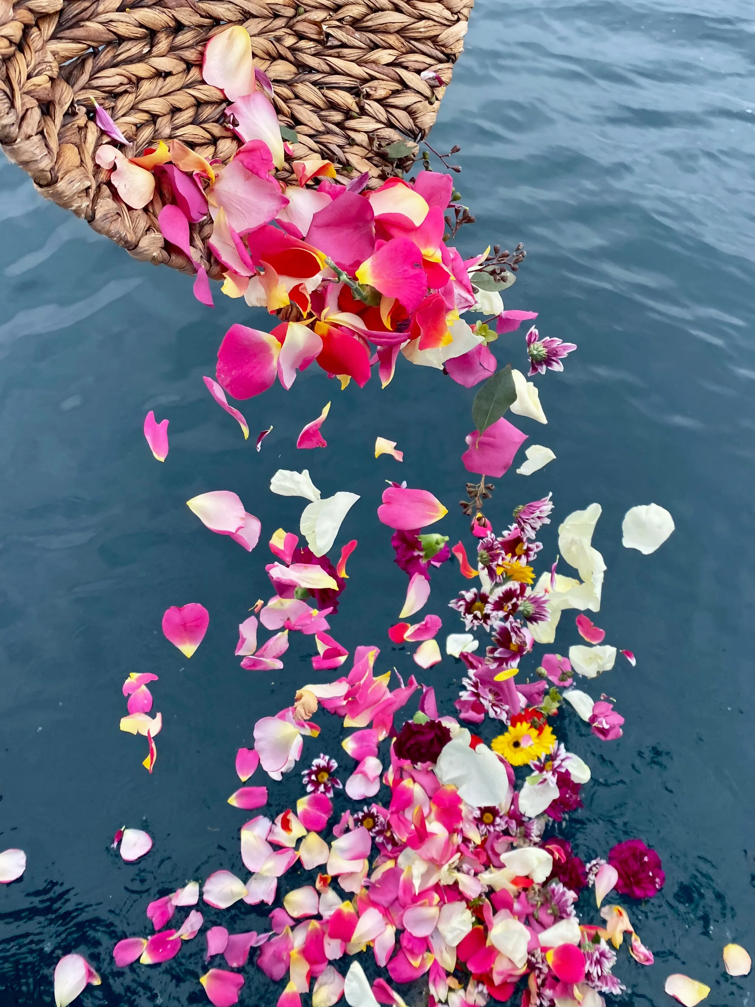 an eco-friendly laying of remains along with fresh seasonal flowers laid on the water